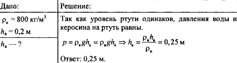 В сообщающиеся сосуды налиты ртуть, вода и керосин (рис. 41). Какова высота слоя керосина, если высота столба воды равна 20 см, а уровень ртути в обоих сосудах одинаков
