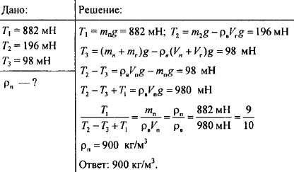 Кусок парафина весит в воздухе 882 мН . В этот парафин заплавили гирю, которая в воде весит 196 мН. Парафин вместе с гирей в воде весит 98 мН. Определите плотность парафина