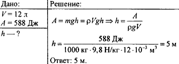 На какую высоту можно поднять ведро воды (12 л), совершив работу 588 Дж