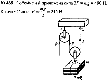 На подвижном блоке равномерно поднимают груз массой 50 кг (рис. 54). Какая сила приложена к обойме АВ неподвижного блока? к крючку С, к которому привязан конец веревки