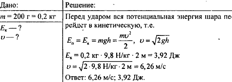 Мяч массой 200 г свободно падает с высоты 2 м на пол. Какой будет кинетическая энергия мяча перед ударом? Чему будет равна его скорость
