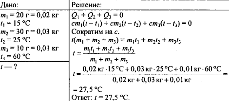 Какой температуры получится вода, если смешать 20 г воды при 15 °С, 30 г воды при 25 °С и 10 г воды при 60 °С