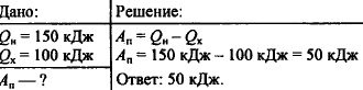 Тепловой двигатель за некоторое время получает от нагревателя количество теплоты, равное 150 кДж, а отдает холодильнику количество теплоты, равное 100 кДж. Определите полезную работу двигателя за это время