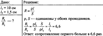 Определите, во сколько раз сопротивление одного провода длиной 10 см больше сопротивления другого провода длиной 1,5 см. (Материал, из которого изготовлены провода, и площадь их сечения одинаковы.)