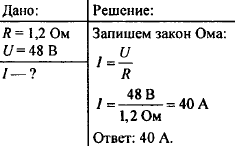 Вычислите силу тока, проходящего через дуговой фонарь, сопротивление которого равно 1,2 Ом, а напряжение 48 В