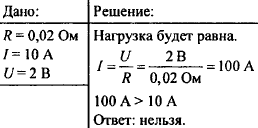 Сопротивление амперметра 0,02 Ом. Максимальная нагрузка 10 А. Можно ли данный амперметр подключить непосредственно к аккумулятору, напряжение на полюсах которого 2 В