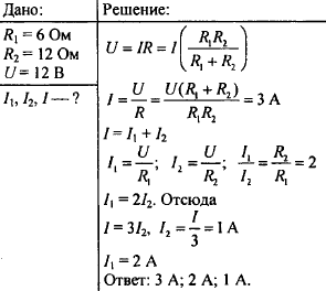 Два проводника сопротивлением R1 = 6 Ом и R2 =12 Ом соединены параллельно и подключены к напряжению 12 В. Определите силу тока; а) в каждом проводнике; б) во всей цепи