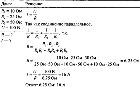 Три проводника сопротивлением 10 Ом, 25 Ом и 50 Ом соединены параллельно и включены в сеть с напряжением 100 В. Определите общее сопротивление этого участка цепи и силу тока в нём