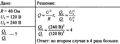 Электрический нагреватель сопротивлением 40 Ом включают сначала в сеть с напряжением 120 В, затем в сеть с напряжением 240 В. В какой сети и во сколько раз в нагревателе будет выделяться большее количество теплоты за одинаковое время