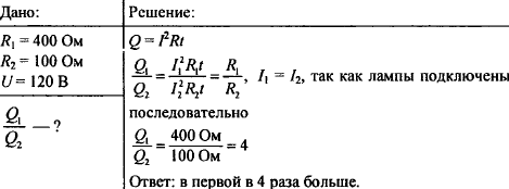 Две лампы, первая с сопротивлением 400 Ом, вторая с сопротивлением 100 Ом, включены последовательно в сеть с напряжением 120 В. В какой лампе будет выделяться большее количество теплоты за одинаковое время
