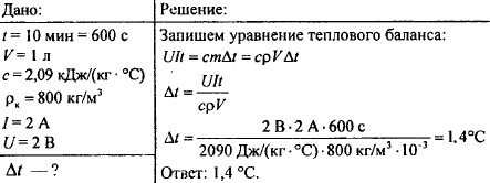 В сосуд с керосином опущена никелиновая спираль. На сколько градусов нагреется за 10 мин 1 л керосина при пропускании через спираль тока силой 2 А при напряжении 2 В? Потери теплоты не учитывать