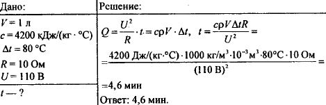 За сколько времени можно нагреть 1 л воды от 20 °C до кипения, если опустить в неё проводник с сопротивлением 10 Ом, напряжение на концах которого 110 В? Потери тепла не учитывать