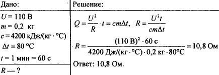 Определите сопротивление проволоки электрического кипятильника, если этот кипятильник, включенный в сеть с напряжением 110 В, доводит до кипения стакан воды (200 г) с начальной температурой 20 °C за 1 мин? Потери тепла не учитывать