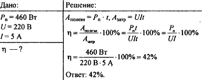 Полезная мощность электродвигателя равна 460 Вт при напряжении 220 В и силе тока 5 А. Определите КПД двигателя
