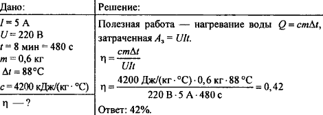 Рассчитайте коэффициент полезного действия электрокипятильника, если известно, что при силе тока 5 А и напряжении 220 В он может в течение 8 мин нагреть 600 г воды от 12 °С до кипения