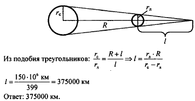 Определите длину конуса тени, отбрасываемого Луной во время новолуния, когда расстояние между центрами Луны и Солнца равно приблизительно 150 000 000 км. Отношение диаметров Луны и Солнца приблизительно 1 : 400