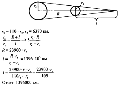Определите длину конуса тени, отбрасываемого земным шаром, который освещается Солнцем. Радиус Земли 6370 км. Радиус Солнца равен 110 земным радиусам. Расстояние от центра земли до центра Солнца составляет около 23 900 земных радиусов