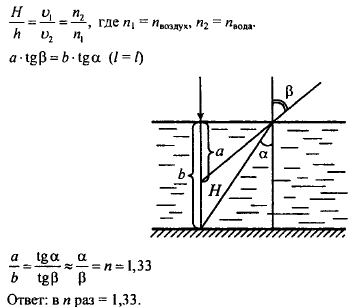 Если смотреть сверху, то глубина реки кажется меньше ее действительной глубины. Определите, во сколько раз действительная глубина больше кажущейся