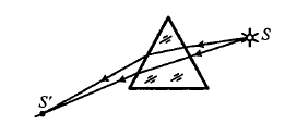 Перед трехгранной призмой (рис. 127) находится светящаяся точка S. В каком месте нам будет казаться эта точка, если смотреть на неё через призму? Начертите ход лучей