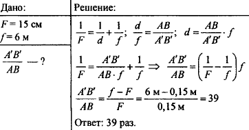 Фокусное расстояние объектива проекционного фонаря 15 см. Объектив находится от экрана на расстоянии 6 м. Определите линейное увеличение изображения на экране