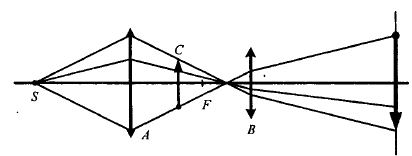 Начертите ход лучей в проекционном фонаре (рис. 136). S — источник света, А — конденсатор, С — диапозитив, В — объектив, F — фокус объектива