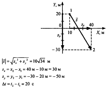 В момент времени t1= 10 с тело находилось в точке пространства с координатами x1 = 10 м, y1 = 20 м. К моменту времени t2 = 30 с тело переместилось в точку с координатами x2 = 40м, y2 = -30 м. Найдите время движения тела. Чему равна проекция перемещения тела на ось ОХ? на ось OY? Чему равен модуль перемещения тела
