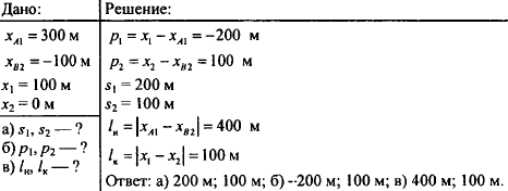 В некий момент времени координата автомобиля xA1= 300 м, а велосипедиста хВ2 = -100 м (рис. 141). Через некоторое время координата автомобиля стала x1 = 100 м, а велосипедиста х2 = 0. Найдите: а) модуль перемещения каждого тела; б) проекцию перемещения каждого тела; в) путь, пройденный каждым телом; г) расстояние между телами в начальный и конечный момент времени