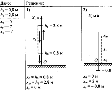 Мальчик, держа в руках мяч на высоте h0 = 0,8 м от поверхности земли, подбрасывает его вертикально вверх. Мяч поднимается на высоту h1 = 2,8 м от поверхности земли и падает на землю. Найдите и покажите на рисунке: а) координату х0 начального положения мяча; б) проекцию перемещения sx мяча за время полета; в) координату хm максимального подъема мяча. Начало координат расположите: 1) на поверхности земли; 2) в точке бросания мяча. Координату х направьте вертикально вверх