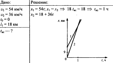 Два автомобиля движутся прямолинейно и равномерно в одном и том же направлении со скоростями 54 км/ч и 36 км/ч. В начальный момент времени t0 = 0 расстояние между ними равно 18 км. За какое время первый автомобиль догонит идущий впереди второй автомобиль? Задачу решите аналитически и графически