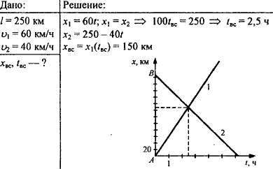 Расстояние между городами A и B равно 250 км. Одновременно из обоих городов навстречу друг другу выезжают две автомашины. Машина, выехавшая из А, движется со скоростью 60 км/ч, а выехавшая из В — со скоростью 40 км/ч. Определите место встречи машин и время их движения до встречи. Решите задачу графически