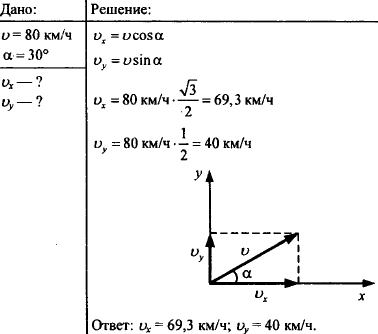 Лыжник спускается по склону горы и в некоторый момент его скорость относительно Земли равна 80 км/ч. Угол склона равен 30°. Найдите вертикальную и горизонтальную составляющие скорости