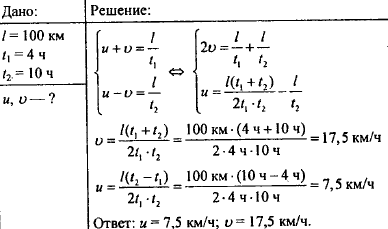 Между двумя пунктами, расположенными на реке на расстоянии 100 км один от другого, курсирует катер, который, идя по течению, проходит это расстояние за время t1 = 4 ч, а против течения — за время t2 = 10 ч. Определите скорость u течения реки относительно берега и скорость v катера относительно воды.