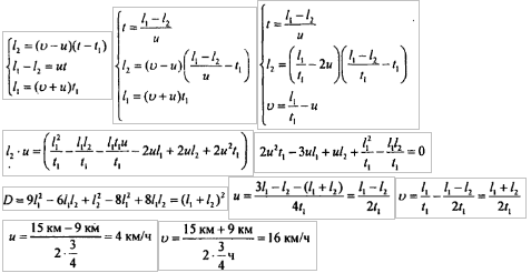Мимо пристани проходит плот. В этот момент от пристани в поселок, находящийся на расстоянии 15 км от нее, вниз по реке отправляется моторная лодка. Она дошла до поселка за время t = 3/4 ч и, повернув обратно, встретила плот на расстоянии 9 км от поселка. Каковы скорость течения реки u относительно берега и скорость лодки v относительно воды