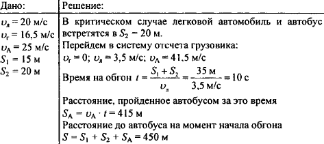 Легковой автомобиль, грузовой автомобиль и автобус имеют относительно Земли скорости 20 м/с, 16,5 м/с, 25 м/с соответственно. Водитель легкового автомобиля начал обгонять грузовой и в этот момент увидел встречный автобус. При каком наименьшем расстоянии до автобуса можно начинать обгон, если в начале обгона легковая машина была в 15 м от грузовой, а к концу обгона она должна быть впереди грузовой на 20 м? (Размеры грузовой машины не учитывать.)