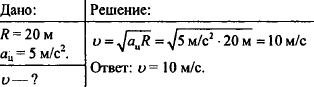 Автомобиль движется по закруглению радиусом 20 м. Определите скорость автомобиля, если его центростремительное ускорение равно 5 м/с2