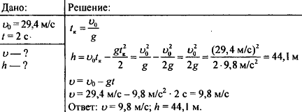 Из пожарного насоса бьет струя воды вертикально вверх со скоростью 29,4 м/с. Какую скорость она будет иметь через 2 с и на какую высоту успеет подняться