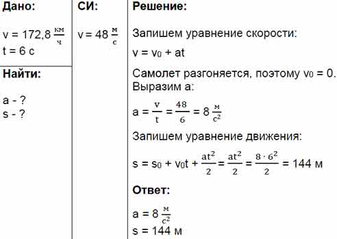 Реактивный самолет для взлета должен иметь скорость 172,8 км/ч. На разгон он тратит 6 с. Считая движение равноускоренным, определите ускорение самолета и расстояние, пройденное самолетом при разгоне