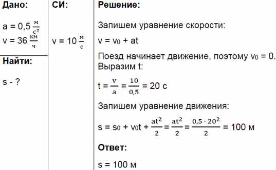 Скорый поезд, отходя от станции, движется равноускоренно с ускорением 0,5 м/с2. На каком расстоянии от станции он будет иметь скорость, равную 36 км/ч