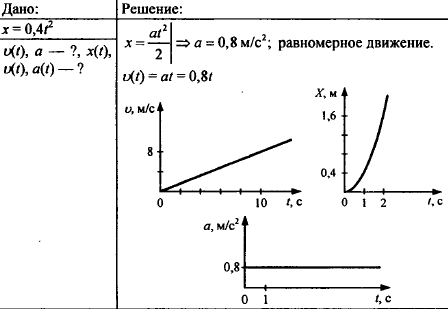Закон движения материальной точки имеет вид: x = 0,4t2 (в СИ). Какое это движение? Найдите зависимость скорости точки от времени. Каково ускорение точки? Постройте график зависимости от времени координаты, скорости и ускорения