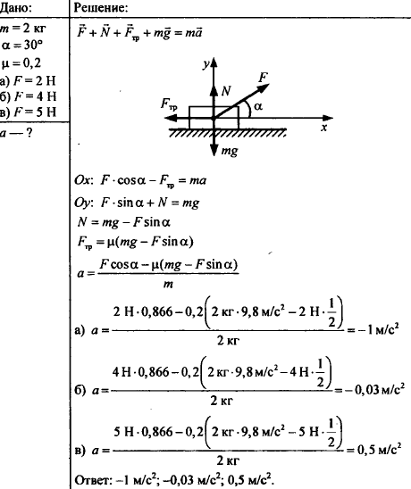 На тело массой 2 кг, лежащее на горизонтальной поверхности, начинает действовать сила F (рис. 153), направленная под углом α = 30° к горизонту. Коэффициент трения между телом и поверхностью равен 0,2. Определите ускорение тела, если модуль силы равен: а) 2 Н; б) 4 Н; в) 5 Н