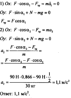 Если к телу массой 30 кг приложить силу F = 90 Н под углом 60° к горизонту, тело будет двигаться равномерно. С каким ускорением будет двигаться это тело, если ту же силу приложить под углом 30° к горизонту