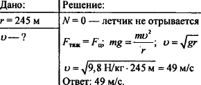 Самолет описывает «петлю Нестерова» в вертикальной плоскости. Определите наименьшую скорость самолета, при которой летчик в верхней части петли не отрывался бы от самолета, если радиус петли 245 м