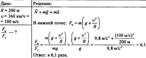 Самолет описывает в вертикальной плоскости «петлю Нестерова» радиусом 200 м. Во сколько раз сила, прижимающая летчика к сиденью в нижней точке петли, больше силы тяжести летчика при скорости самолета 360 км/ч