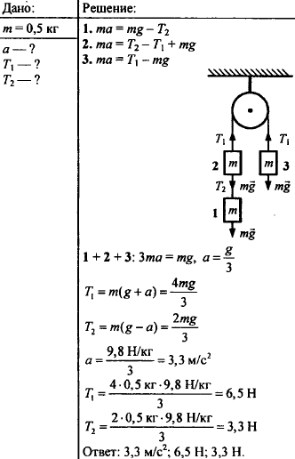 Через легкий блок перекинута нить, к которой подвешены три одинаковых груза массой 0,5 кг каждый (рис. 165). Определите ускорение системы и силу натяжения каждой нити