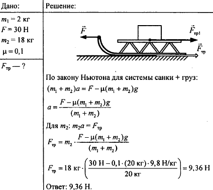 Сани массой 2 кг тянут за веревку силой 30 Н, направленной горизонтально (рис. 166). На санках лежит груз массой 18 кг. Коэффициент трения полозьев о снег равен 0,1. Найдите силу трения, действующую на груз