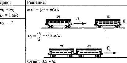Чтобы сцепить два одинаковых железнодорожных вагона, стоящих на рельсах на небольшом расстоянии друг от друга, первому сообщают скорость 1 м/с. Какой скоростью будут обладать вагоны после сцепления