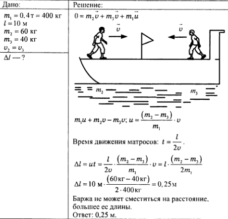 В полный штиль пустая баржа массой 0,4 т и длиной 10 м неподвижна на поверхности залива. Два матроса массой 60 кг и 40 кг с противоположных концов баржи