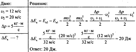 Мяч, летящий со скоростью 12 м/с, отбрасывается ударом ракетки в противоположную сторону со скоростью 20 м/с. При этом модуль импульса мяча изменился на 5 кг• м/с. На сколько при этом, изменилась кинетическая энергия мяча