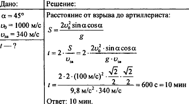 Из орудия произведен выстрел под углом 45° к горизонту. Через какое время артиллерист услышит звук разрыва снаряда, если начальная скорость равна 1000 м/с? Сопротивление воздуха не учитывать. Скорость звука в воздухе 340 м/с