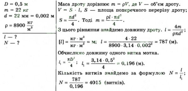 Яка довжина мідного дроту, змотаного в моток із середнім діаметром 0,5 м, якщо маса дроту становить 2 2 кг, а діаметр дроту — 2 мм? Скільки приблизно витків дроту в мотку?